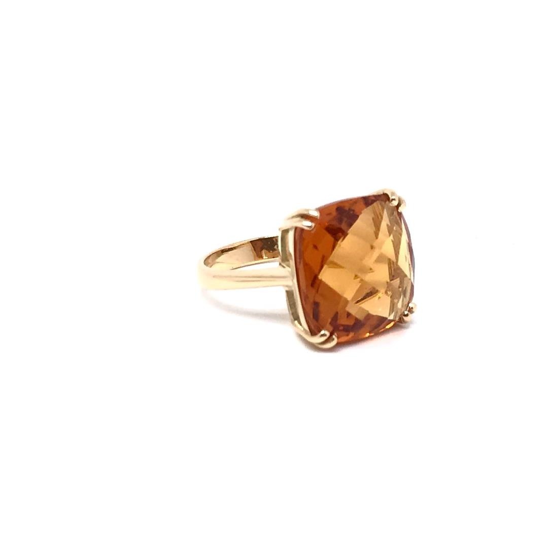 Questo straordinario anello è realizzato in oro giallo 18 carati, con un peso di 4.70 g, e impreziosito da un magnifico quarzo citrino naturale da 8.1 ct, taglio cuscino, che esalta la brillantezza e l’intensità del colore della pietra.